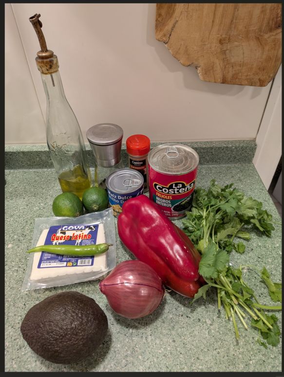 So as said above, the best this is so easy: just make the dressing in the bottom of a bowl, add the beans, corn, red pepper, cilantro, jalapeño, and red oñions and then mix. Then add the squisher stuff: cheese and avocado and gently fold it in. And you are done!