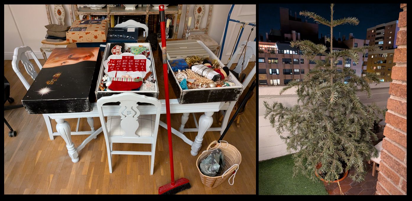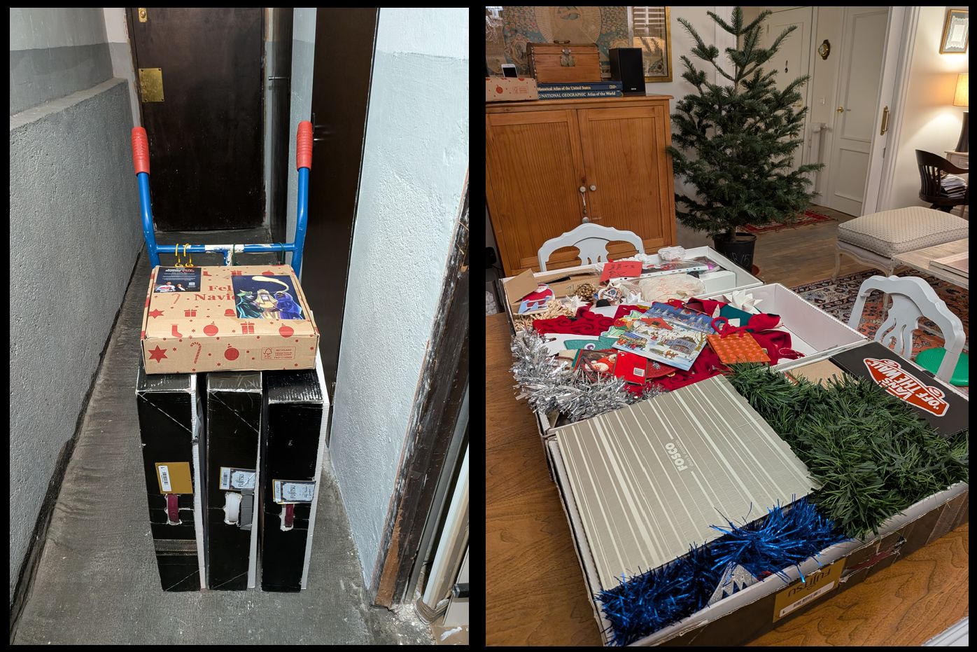 The actual decorating of the tree I kinda think had to wait a few more days, but at this point can’t remember. I did document the transportation of the decorations which did happen the same day
