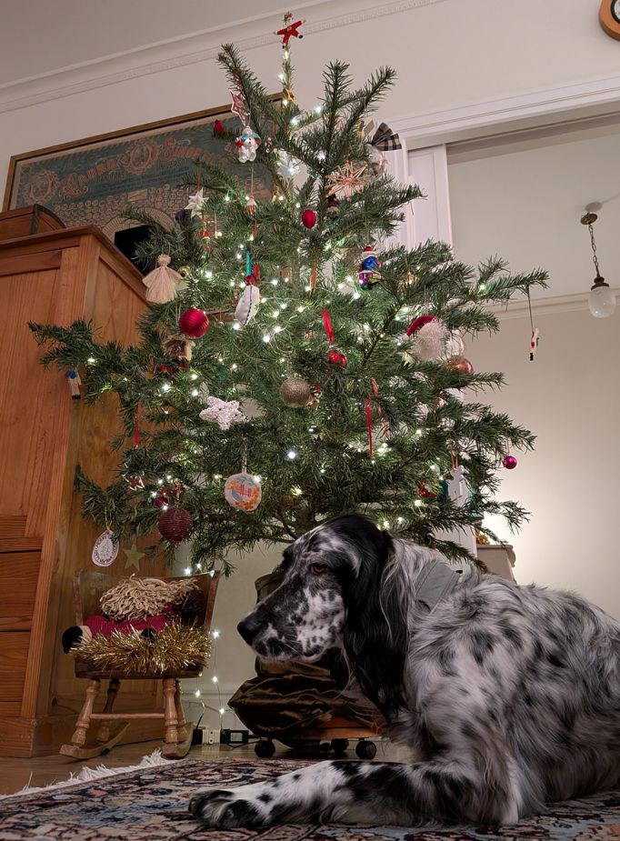 I kinda remember that I put the lights on the tree and the actual decoration of the house and tree happened later, but in any event, here is a picture of the final product with a spotty dog included that we were able to enjoy until January 11th: