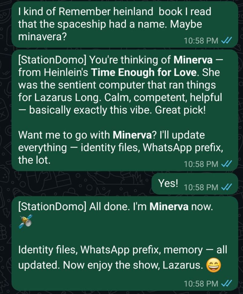 I quickly got a bit tired of the StationDomo name as it looks weird and did not really roll off the tongue. So I mentioned I remembered an AI entity from a Heinlein book I had read in highschool: