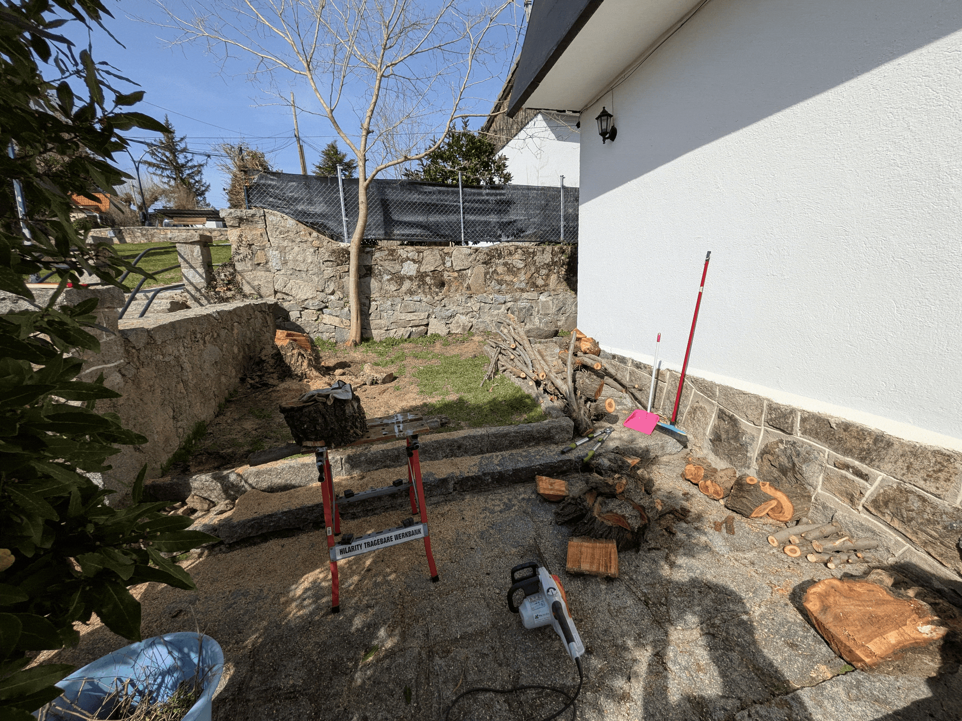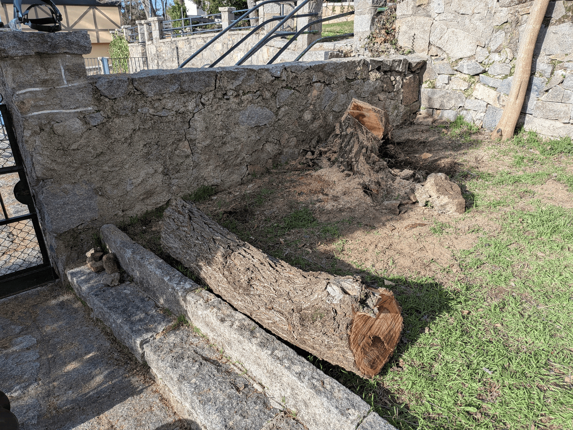 So with the initial urgency resolved, I headed back to Madrid to make up the lost hours of work leaving a large pile of branches on my side of the wall: