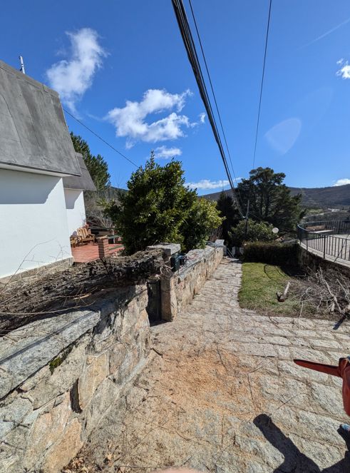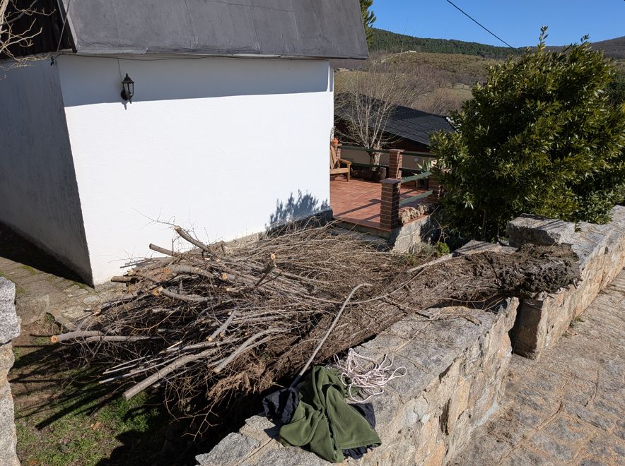 I got the call as the sun was setting so we agreed that little could be done that day (Monday), so I got up early on Tuesday and was in Cercedilla at 08:00 do an initial assessment. It was clear that there were some thick branches to deal with but the majority were pretty thin, so I figured I could put a reciprocating saw that I had recently purchased to use and see what it was capable of as I had actually gotten it to deal with some invasive trees that did not have really think trunks. I also had a pretty big bow saw that I figured I would have to use on the thicker branches.