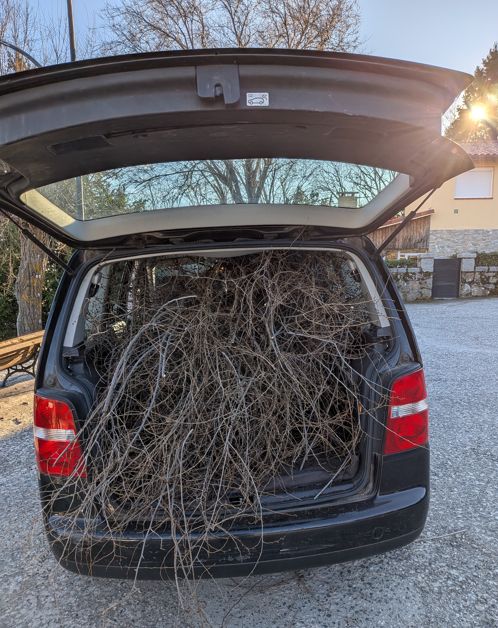 Please note before trying this at home: The said Volkswagen has been discussed here previously in the blog as any day now Madrid will force me not to use it anymore so as you can imagine, I have no problem accepting any of the cosmetic damages that it may suffer stuffing it to the gills with pokey branches and turning it into a pickup truck.