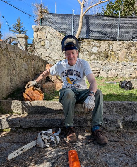 So as I was scratching my head trying to figure out how to release my saw blade when a neighbor who I had never met, Clemente, walked by. He said he had a chainsaw that would make quick work of the problem. I am normally a “do it on my own and never ask for help” type of guy, but I was tired and realizing that even if I freed the reciprocating saw blade, I did not have the right tools for the job, so I told him that would be amazing. He said cool no problem. He had to change and do something but would be back in 20 minutes or so. Wow. That is how unknown neighbors in Cercedilla are! He said in the meantime I should tie down the wires as once we cut what was supporting them, they would fly up and could be dangerous, and that was the previously foreshowed way that my safety was saved by the stuck saw blade and a smart neighbor.